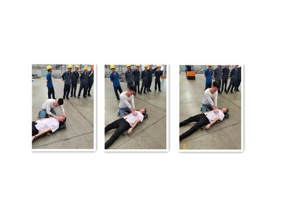 2、2021年7月26日上午10:00分左右,制造部車間員工XXX在作業(yè)過程中突然出現(xiàn)中暑現(xiàn)象,現(xiàn)場應(yīng)急人員立即將中暑人員轉(zhuǎn)移到陰涼通風(fēng)處,并讓病人平臥,解開衣扣,松開或脫去衣服,按摩軀干和四肢的皮膚肌肉,加速外圍血液循環(huán),促進(jìn)散熱(或用冷水或用冰袋置于病人的頭、頸、腋下、腹股溝等處,或用酒精擦拭病人的頭、頸、腋下、腹股溝等處進(jìn)行散熱)。針對重度中暑者,在采取上述措施的同時,立即撥打120,將患者迅速送往有條件的大醫(yī)院急診科治療。一旦發(fā)現(xiàn)病人呼吸、心跳停止應(yīng)立即進(jìn)行心肺復(fù)蘇。中暑急救演練、人工呼吸及胸外心臟按壓法演練圖片如下: